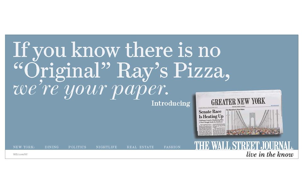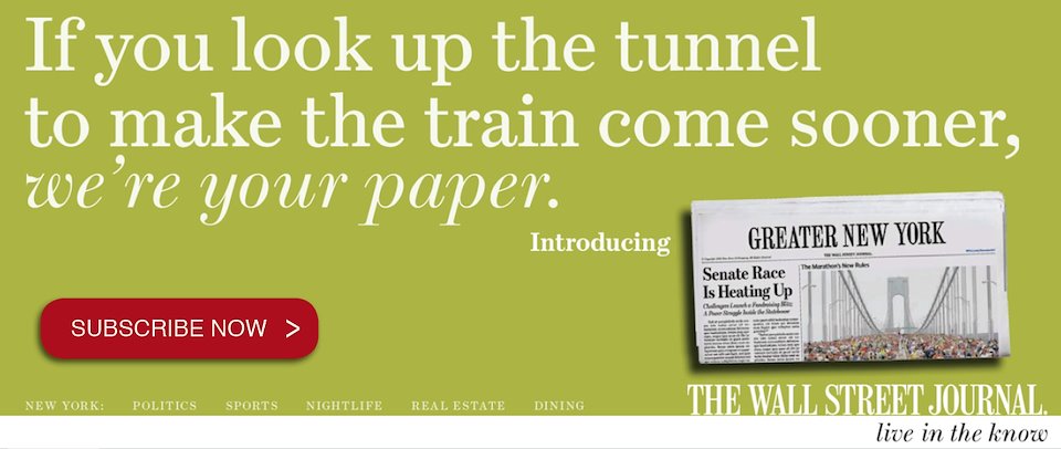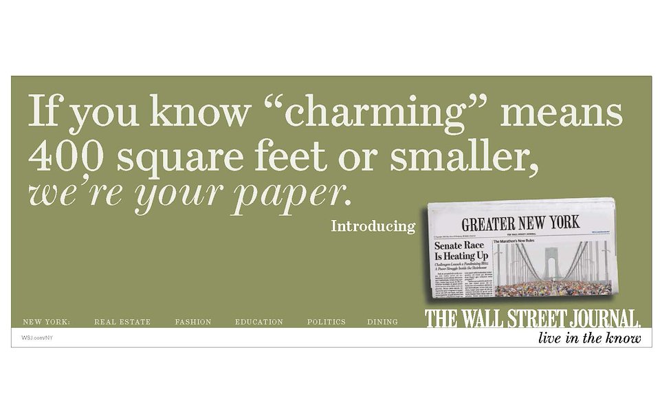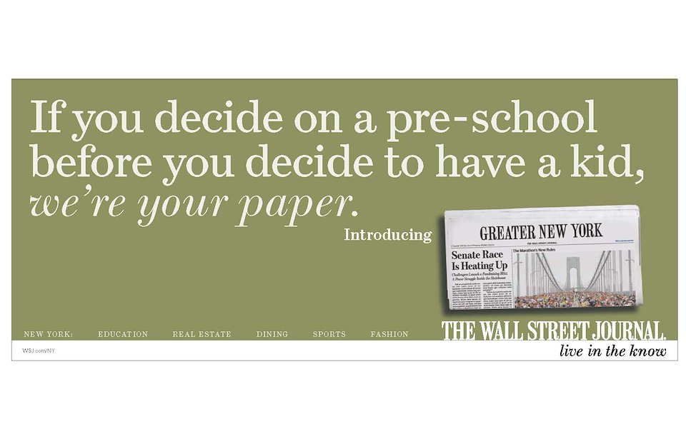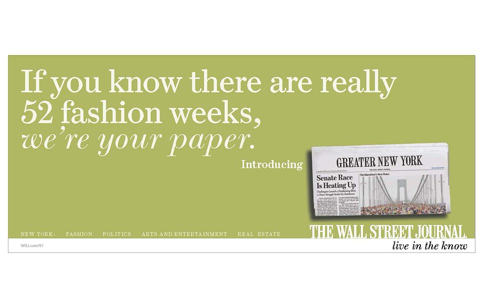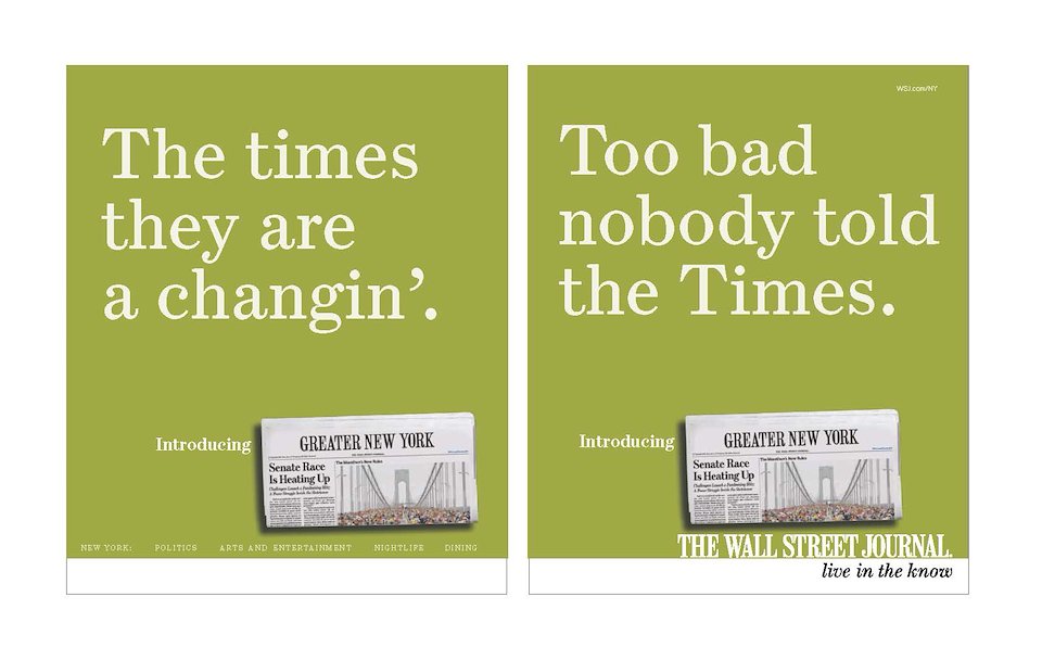 THE CHALLENGE: The New York Times Metro Section was losing circulation because it was no longer seen as a local New York paper. It was perceived as watered down, and lacking the hyper-local insights that made it the gold standard in covering New York. The Wall Street Journal saw this vulnerability, and in response introduced Greater New York, it’s New Yorker-centric answer to the Times' milquetoast Metro Section.